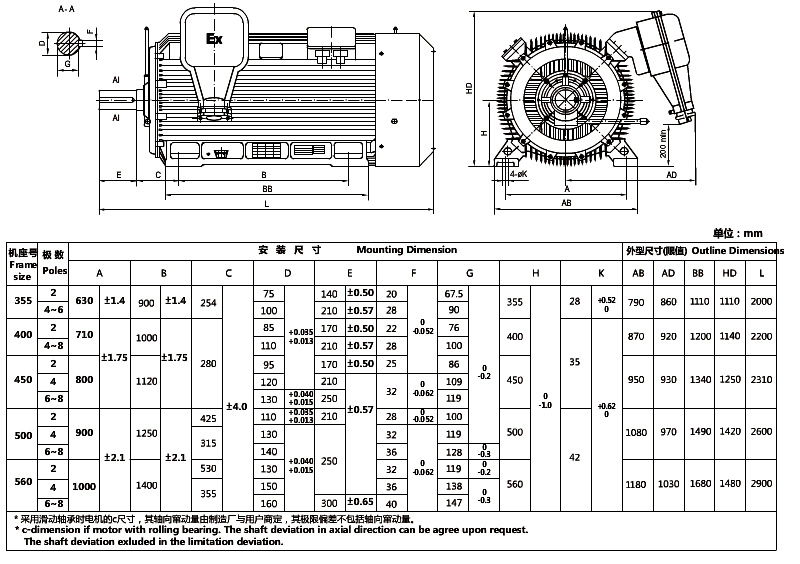 根据不同的功率和转速轴承结构选型:H355~560-4、6、8P采用滚动轴承