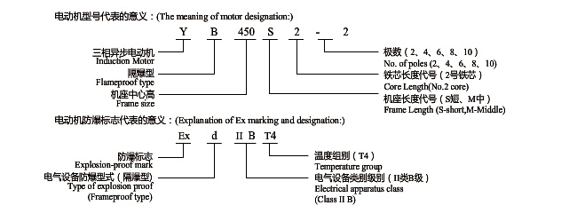 YB355-450系列高压隔爆型三相异步电动机采用我国最新国家标准和国际电工委员会IEC标准,功率范围从160kW~500kW. YB355-450系列高压隔爆型三项异步电动机符合GB755《旋转电机 定额和性能》,GB3836.1《爆炸性气体环境用电气设备 第1部分:通用要求》,GB3836.2《爆炸性气体环境用电气设备 第2部分:隔爆型“d”》的规定,制成隔爆型电动机,防爆标志为ExdI、ExdII AT4、ExdII BT4、ExdII CT4,适用于具有爆炸性气体环境的1区,2区危险场所。