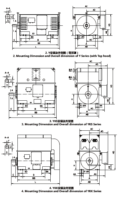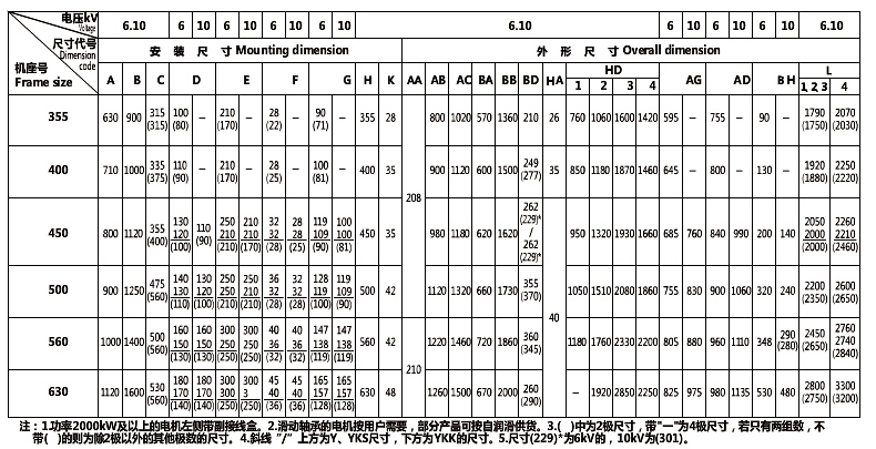 Y, YKK, YKS系列(6kV、10kV)高压三相异步电动机(机座号355-630)外形及安装尺寸见表。