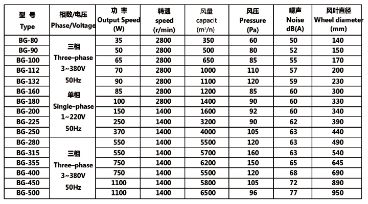 四、BG系列防爆变频电机用通风机技术参数